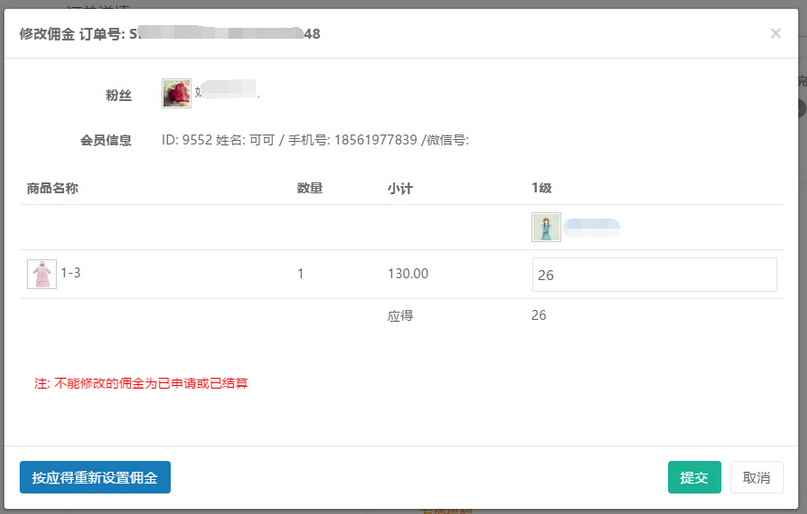 在查看待發(fā)貨詳情頁面中,點擊“修改傭金”可已修改分銷商所獲取的傭金金額,參見下圖: