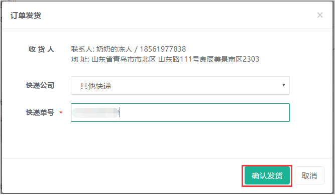 商家查看確保信息無誤后,則可回到待發(fā)貨列表中或在訂單詳情中點擊【確認(rèn)發(fā)貨】,輸入快遞單號再次點擊【確認(rèn)發(fā)貨】,此訂單就會到【待收貨】中進(jìn)行統(tǒng)計列示,參見下圖: